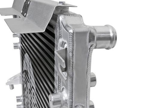 This BladeRunner GT Series Radiator keeps your 2012-18 Jeep Wrangler JK with the 3.6L running cooler, longer. 1 3/4" bar and plate aluminum core design and 1/8" aluminum end tanks handle rock-crawling and street hauling. Includes upper and lower 5-ply polyester reinforced silicone hoses and quality stainless steel, T-Bolt clamps for a simple, secure installation. Unique 1 3/4" Bar and Plate Core Design: 25% more efficient than factory tube and fin core design. The BladeRunner features a bar and plate core design which provides greater heat dissipation and better coolant flow for optimum cooling efficiency. Flow and Performance: Aircraft-grade aluminum construction and larger core offers 25% more coolant capacity to maintain cooler temperatures. Includes both upper and lower 5-ply polyester reinforced silicone hoses that withstand high- temperatures and outlast factory rubber hoses. End Tanks: The unique BladeRunner end tanks are constructed out of 1/8'' TIG-welded aluminum plates for strength and durability. Billet Aluminum Inlet/Outlet: 1 1/2" diameter billet aluminum inlet and outlet for long-lasting reliability. TIG-Welded: 100% TIG-welded for race proven strength and durability. Brass Drainage Valve: Includes a brass drain valve with a barbed fitting to connect a hose for draining coolant easy and mess free. Perfect Fit: Utilizes the factory mounting locations to provide stability for a hassle-free installation. Includes high quality, stainless steel, T-Bolt clamps and heavy-duty 5-ply silicone hoses for strength. Custom Appearance: Brushed aluminum finish with an aFe Power logo painted on the front. Radiator hoses are finished in black silicone with an aFe Power logo printed on them.