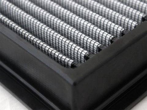 Constructed with 100% polyurethane, this high-flow, oiled OE replacement performance filter will outflow the stock filter by up to 31% for improved horsepower and torque. The Pro 5R air filter uses five layers of progressively finer mesh cotton gauze media to provide maximum airflow for best performance results. Washable and reusable for multiple cleaning cycles, the tall, open, evenly spaced pleats provide excellent dust holding capacity for a longer service cycle between cleanings. An integrated urethane bump seal insures a tight, leak free seal over the life of the filter. Pro 5R Media: This filter features a 5-layer progressive, oiled media to provide maximum flow with excellent filtration. The progressive layering of media allows the filter to flow at high levels even when dirty. The Pro 5R filter media has been tested at 98.6% cumulative efficiency. Rounded Open Pleats: aFe performance air filters use a rounded pleat design which produ ces more useable filter surface area for increased flow and greater dust holding capacity. Progressive Bump Seal: This pliable sealing surface conforms to even the most uneven filter housing, eliminating the use of gaskets or sealants. The soft urethane construction always goes back to its original form so you will never deform the bump seal. This makes for a perfect filter fit and sealing surface every time. Full Urethane Housing: aFe Power performance air filters are constructed using 100% urethane frames. This construction allows for a proper OE style fit with excellent filter strength. aFe Power OE replacement performance filters have a limited lifetime warranty.