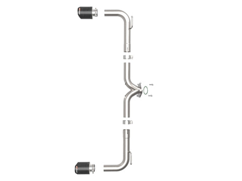 This system produced gains of up to +6.45 HP and +8.12 lbs. x Ft. TQ., as measured on our in-house dyno. This axle-back exhaust system is constructed of 2-1/2" mandrel-bent 304 stainless steel tubing for maximum strength and durability. Finishing off this exhaust system are dual 4-1/2" diameter carbon fiber 304 stainless steel clamp-on exhaust tips. The tips features a laser etched aFe POWER logo for a unique style. This system produces a deep sound unleashing all available horsepower and torque. Utilizing a factory style flange and hangers this system is a direct bolt-on system, which requires no cutting or modifications for a hassle-free installation. A mitered merge collector is used to decrease turbulence and increase exhaust velocity resulting in increased horsepower, torque and improved throttle response. Utilizing state-of-the-art computer-aided design technology, this exhaust system is designed for custom, high tolerance factory fitment. 100% MIG-Welded for race-proven strength and durability.