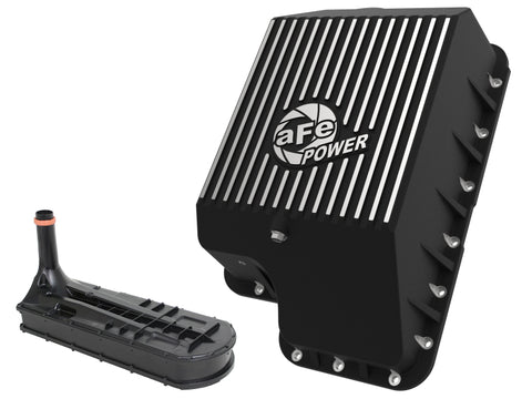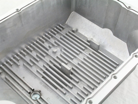 aFe Powers new deep transmission pan brings performance engineering to the protection of your trucks transmission. This transmission pan has additional capacity for 3 to 4 more quarts over stock at the factory line, a magnetic drain plug and a 1/8" NPT port for your temperature sensor. Built-in internal and external fins transfer heat from the fluid to the outside air for maximum cooling. This transmission pan is constructed out of durable die-cast A380 aluminum with reinforced ribs and a wrinkle black powder-coating for maximum strength and styling.