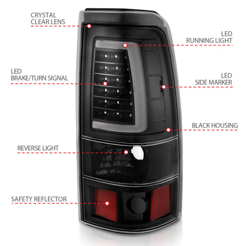 Tail Light Assembly, LED, Clear Lens, Black Housing, Pair, Plank Style Design. Guaranteed To Improve Your Vehicles Appearance. Rigorously Tested For Fit And Function. Simple Plug And Play. No Modifications Required. Easy Installation Using Common Hand Tools. Uses Stock Mounting Locations And Hardware. D.O.T. Compliant To S.A.E. Standards. Sold As A Pair.