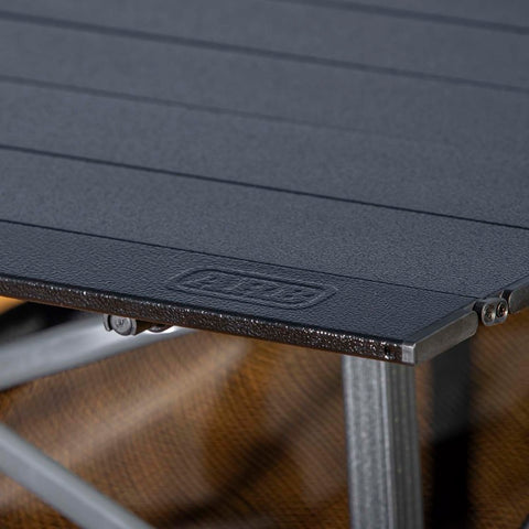 The ARB Pinnacle Camp Table is perfect for cooking and eating on the move. Its durable frame is made from black aluminum with contrasting charcoal crossbars. The generously sized, black, rugged tabletop provides ample space for mealtime or game night. Each leg can be independently adjusted to allow for stability on uneven surfaces, and the table height can be adjusted anywhere from 31 to 39 inches. The built-in brackets on the frame hold the included mesh basket for added storage. The table packs into a compact 600D polyester carry bag featuring a built-in internal divider to separate the tabletop from the frame.