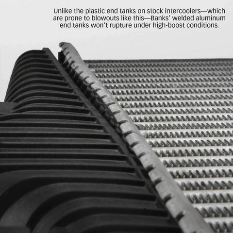 Superior to stock, everything about Banks Techni-Cooler Intercooler system is bigger. It includes mandrel-bent 3.5 inch high-flow boost tubes... large, high-efficiency all-aluminum end tanks instead of the wimpy stock plastic ones that can rupture under high-boost conditions... a wide-open inlet and outlet... a 19% thicker core area with a 21% improvement in volume... and a colossal super-flow High-Ram intake manifold. Techni-Cooler dramatically increases the cooling capacity by balancing the richer fuel mixture with greater airflow and cooler, denser air. Denser air has more oxygen, which improves combustion as well as engine efficiency. Result: higher continuous power and more power at any exhaust gas temp (EGT), better fuel economy and lower EGTs. That's a truckload of benefits! Banks Techni-Cooler delivers the maximum reduction in boost air temperature with a minimal loss of boost pressure. It doesn't get any cooler than Techni-Cooler ! Mounting hardware included. Eliminates restrictions, dramatically increasing the cooling capacity for massive continuous power. Big aluminum end tanks won't burst like the plastic stock ones.;Please note: 2005 Excursion owners must identify which manifold they have.