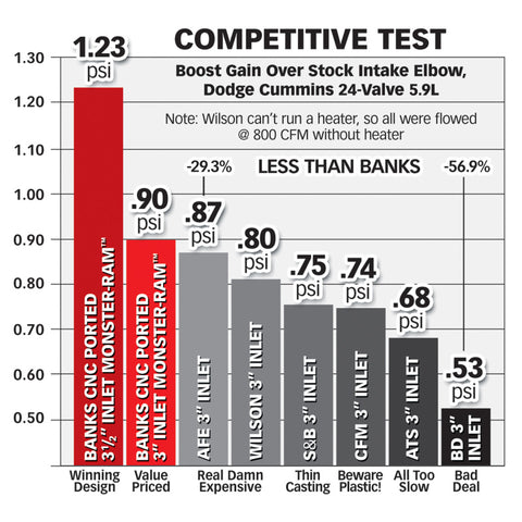 Monster-Ram improves airflow from the intercooler. Raises boost without increasing backpressure at the turbine. Result: a more responsive, fuel-efficient engine. Up to six 1/8 inch NPT ports for flexibility! At Banks Power, just enough is never enough when it comes to engine airflow. Maximum power, performance and efficiency are the ultimate goals, but to make it all happen the engine has to breathe freely and without needless restrictions. Finding ways to pump your engine full of cooler, denser air has always been the key. Our High-Ram intakes have always whipped the competition. Our new Monster-Ram flat-out destroys it. Utilizing the latest in electronic computational fluid-dynamic technology, tested on the flow bench as well as on the dyno, and finally proven in the real world where the rubber meets the road, Monster-Ram is a beast that only Banks could have unleashed. A simple, direct-replacement casting, Monster-Ram is instant power, performance and acceleration gratification. The factory inlet is cramped and angular compared to Banks' larger, streamlined cast-metal Monster-Ram. It's the perfect upgrade whether you're just starting out or working to build a serious, purpose-built machine. And with up to six ports for water/meth/propane/nitrous injection (or pressure/temp. sensors), the sky's the limit for performance expandability. Monster-Ram is CNC port-matched to the stock heater as well as the optional Banks Billet Intake Grid Heater Delete spacer. Proof positive that Banks Monster-Ram outflows the competition by nearly 57%! Did we rig the test by doing anything to hurt the other guys' product performance? No way. We just kept improving ours until we put them on all back on the trailer.