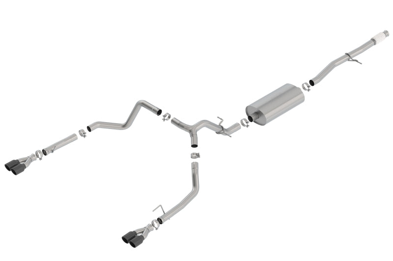 Factory Split Rear Exit Vehicles ONLY. This system features a black chrome finish on T-304 stainless steel tips. Using BORLA? Stainless Steel Polish p# 21461 is NOT recommended with these black chrome tips. We suggest cleaning the tips with hot water and a microfiber cloth. Add adapter 60708 for crew cab standard bed (6' 7") 157" wheelbase vehicles. BORLA? Cat-Back? and Axle-Back exhaust systems feature patented straight-through and multi-core technology designed to unleash hidden horsepower. Increased exhaust velocity adds power, driving excitement, fuel economy, and the distinctive BORLA7reg; Sound of Power respected by motoring enthusiasts everywhere. Each system is built from premium T-304 stainless steel, superior to T-400 series knockoffs (such as 409), to give you the absolute best in performance and durability. Ultra-smooth mandrel bends ensure maximum flow & power, and precision computer numerical control (CNC) manufacturing ensures an accurate fit. Best of all, BORLA? stands behind every system with a Million-Mile Warranty. Just what you'd expect from the world's most experienced (and most winning) exhaust brand.