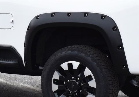With their recessed stainless steel bolts and massive presence, Pocket Style(R) Fender Flares are a Bushwacker original and an off-road icon. They give you the hard-core look of bolt-on flares, with no body-side sheet metal drilling required. Pocket Style Fender Flares are custom-designed for your vehicle to complement oversized tires and high-clearance lift kits. You can mount them right out of the box with their tough, OEM-style matte black finish—they're UV protected so they won't chalk. You can also paint them to match or accent the body color for a factory-custom look. Pocket Style Fender Flares are made in the USA from our thick, warp-resistant Dura-Flex(R) 2000 material and tailor-made for added durability and flexibility on the trail. When you need maximum tire coverage with minimum time and effort, it's in the pocket. Pocket Style Fender Flares from Bushwacker.