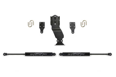 2017-20 Ford F250/F350 4WD. Fabtech's Dual steering stabilizer kit helps provide damping for the stock Super Duty steering system to reduce tire shake caused by oversized tires and wheels. The Stealth stabilizers are a monotube design that eliminates dead spots in the damping for superior performance. They are constructed with a nitro carburized piston rod for maximum corrosion resistance. Each of the stabilizers are mounted above the steering center link in opposing directions. This position keeps the stabilizers protected from obstacles when offroad while providing equal damping to each front tire and wheel. Features: Provides increased damping to the stock steering when using large tires. Dual Stabilizers are mounted opposing for maximum tire control. Bolt on installation.