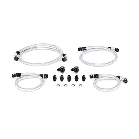 The Mazda RX8 has a high-winding rotary engine capable of easy reaching 9,000RPMs on a daily basis. With those revs comes very high oil temperatures. Most RX8 models with manual transmissions were outfitted with dual oil coolers from the factory to keep the rotary engine's oil at a safe temperature during high speed driving and track situations. Unfortunately, over time, the stock rubber oil lines and steel fittings can severely corrode and degrade over time. This full kit from Mishimoto replaced all oil lines with braided stainless units and aluminum fittings that will not corrode or degrade over time. This kit also replaces the most frequent line to corrode, which is located on the left hand side of the car near the front suspension assembly. With the Mishimoto replacement oil line kit, all oil lines between the engine, and both oil coolers are replaced, including the intermediate line that spans both oil coolers found in all manual transmission models. The oil line fits onto the vehicle with no additional modification, and does not require any cutting to your vehicle or permanent removal of parts. This oil line kit comes with all banjo bolts, M18 fittings, and a male to male -10AN connector to complete the installation. Keep you RX8 protected and running smooth! As with all our products, this kit includes the Mishimoto Lifetime Warranty.