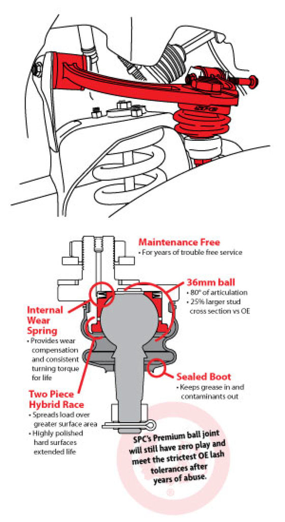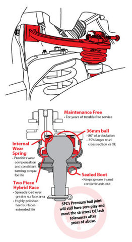 Improve droop travel, drivability and tire wear as well as adjusting tire position in your wheel well with SPC's adjustable front upper control arms for the Frontier, Pathfinder, and Xterra. Featuring our long life maintainable ball joint and SpecRide bushings, this arm is designed to correct alignment angles while maintaining factory ride quality. SPC's integrated tubular and cast steel design provides the strength and durability needed for the most demanding environments. These remove and replace armsare available in pairs for lifted and off-road applications. Get more droop travel: SPC's arm has improved clearance to get around the spring bucket when the arm droops, eliminating arm to frame contact on lifted trucks. The maintainable ball joint has an oversized ball and allows more than 80° of articulation to ensure it never binds. SpecRide bushings have free pivot to eliminate any chance of bushing failure seen on many high travel suspensions. Get your drivability and tracking back: When you lift your truck you affect caster and camber. SPC's arms have +1° of caster built into them. Using its patented ball joint design the arm will get you -1° to +3° of caster and ±2° of camber. Get your tire where you want it in the wheel well: Use adjustment in the control arm and on the OE lower cams to maximize alignment angles and move oversized tires forward in the wheel well to minimize or avoid fender trimming. To make installation easier, SPC now includes a bolt to replace the driver's side rearward bolt, which often needs to be cut out to remove the original arm. If you need more bolts for the other positions order p/n 21035 replacement bolt kit (2 bolts). Do you need replacement cams for the lower controlarm? Check out SPC p/n 87520, which will replace corroded cam bolt assemblies, or can be used on trucks not equipped with factory cam bolts for the lower control arm. These cams should be used with the upper arm kit